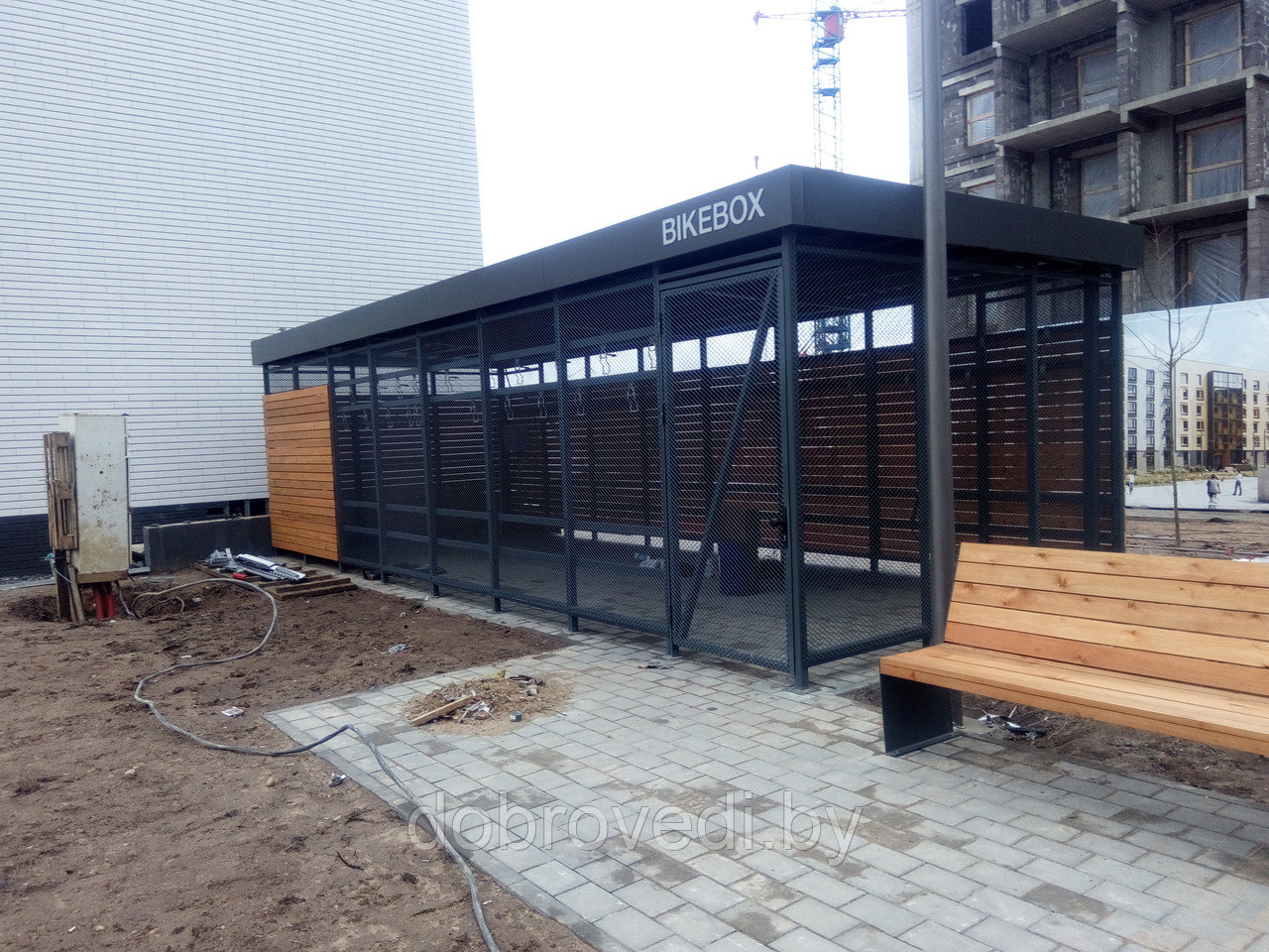 Крытая велопарковка (велостоянка) для постоянного хранения велосипедов. Изготовление по согласованию с заказчиком может включать укладку тротуарной плитки. Покрытие из любого кровельного материала или поликарбоната.